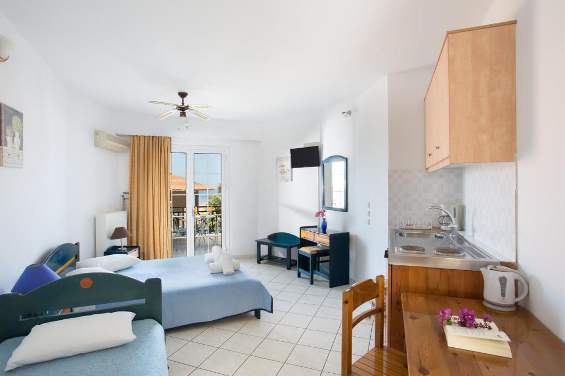 Our Junior Suite is a double room with double bed, a small kitchenette, fully equipped, a big window and a private balcony with panoramic view of the sea and the castle of Monemvasia..